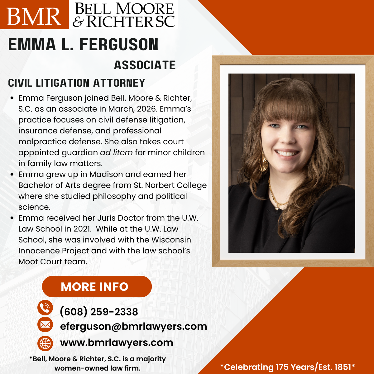 Bell, Moore & Richter, S.C. introduces Emma L. Ferguson as an associate to the BMR Team. (See more.)